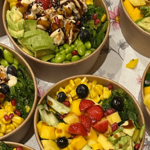 Gemarineerde zalm, zeewiersalade, avocado, komkommer, mango, edamame met sushirijst.